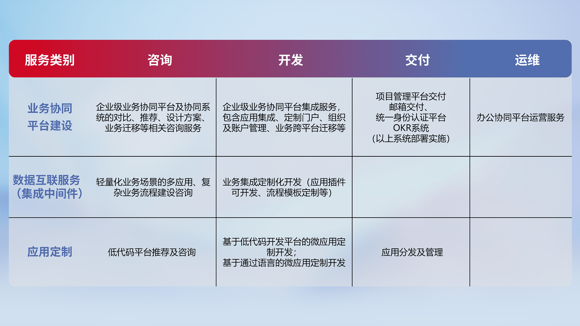 针对钉钉、、、、企微、、IDaas等平台级产品提供产品的规划、、、方案、、交付、、、定制化开发等服务,,实现如统一协同办公、、、、智能客户服务、、混合会议管理、、、智能数据查询、、等业务场景,,,,实现数字化转型。。