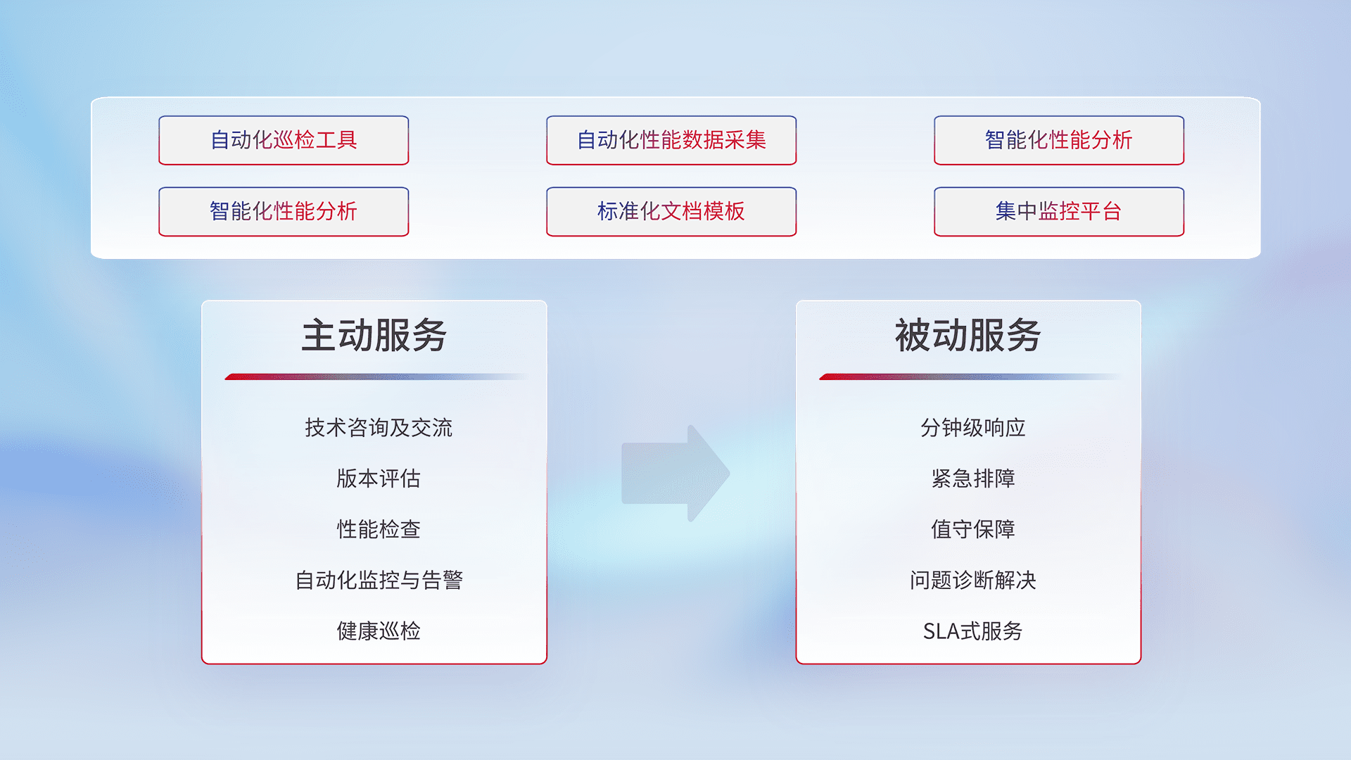 智能化工具和标准化文档,,,,保障服务质量,,,提供主动服务(包含技术咨询、、、、版本评估、、、、性能检查、、、、自动化监控与告警、、、健康巡检)和被动服务包含(分钟级响应、、紧急排障、、值守保障、、、问题诊断解决、、SLA服务)。。