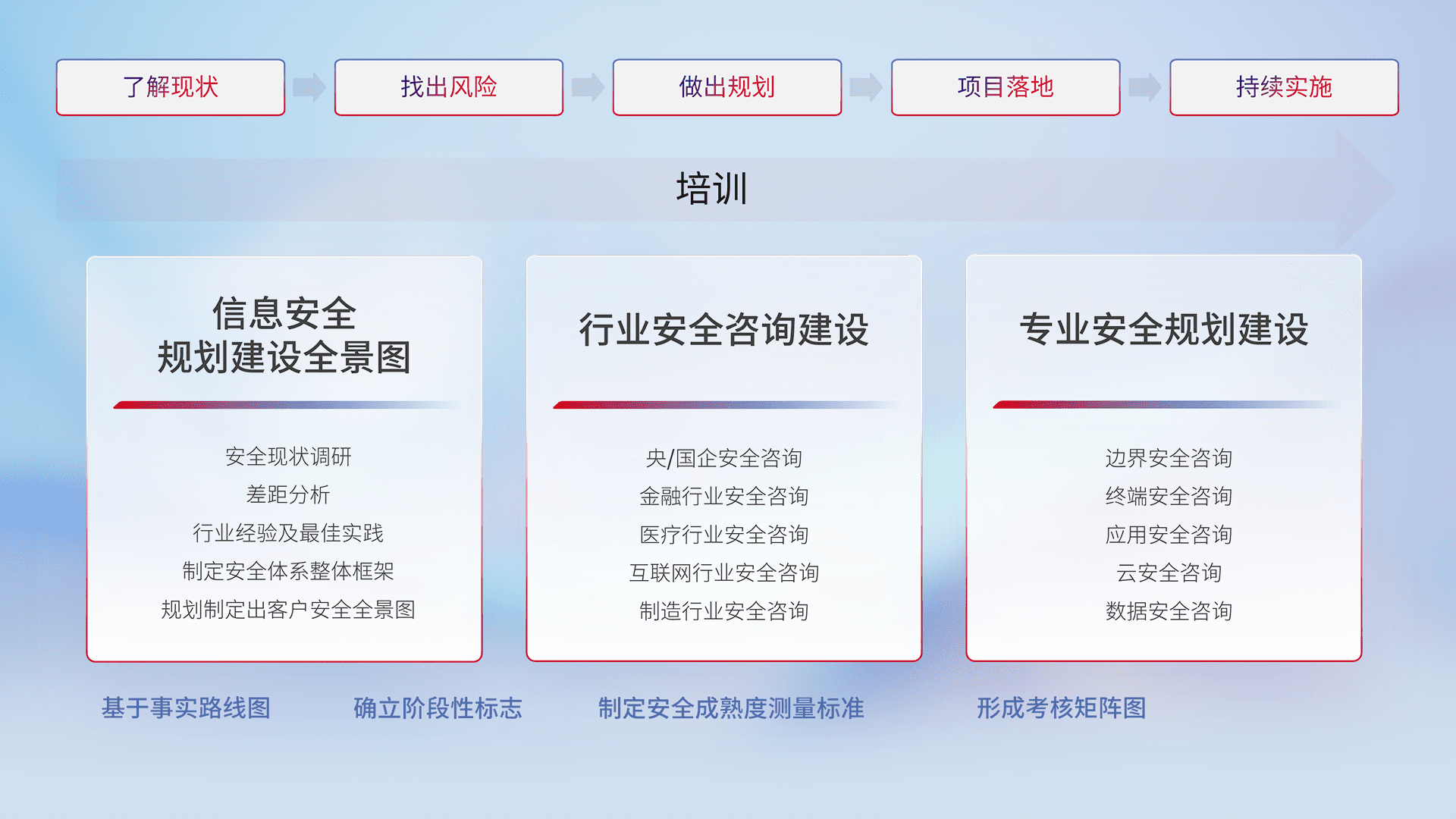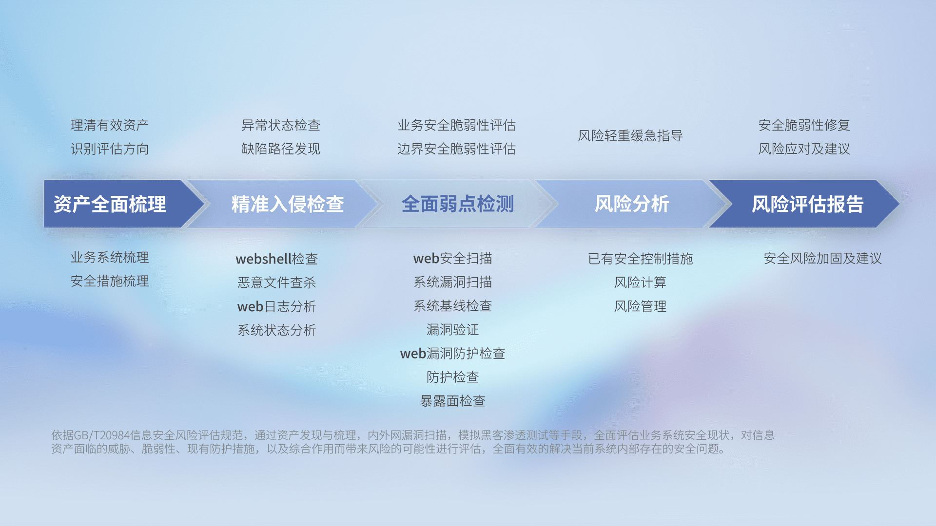 针对客户行业特性,,,,以专业的安全服务+多厂商联合解决方案提供专属的一站式安全管理服务,,,,帮助客户全面感知网络空间威胁,,,基于识别、、检测、、、分析、、防护、、、监测、、、、响应的服务理论模型,,,,从方案咨询、、集成交付、、、、评估验证、、、优化加固、、、、运维运营,,致力于为客户提供完整的闭环管理式安全服务。。。。以实战经验为客户打造高抵御风险的安全体系,,,,帮助客户发现威胁、、、对抗威胁、、处置威胁,,,不断积累安全对抗能力,,持续保障数字化安全。。。